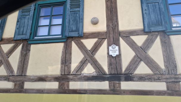 Eine Kanonenkugel in einer Hauswand in Beelitzt